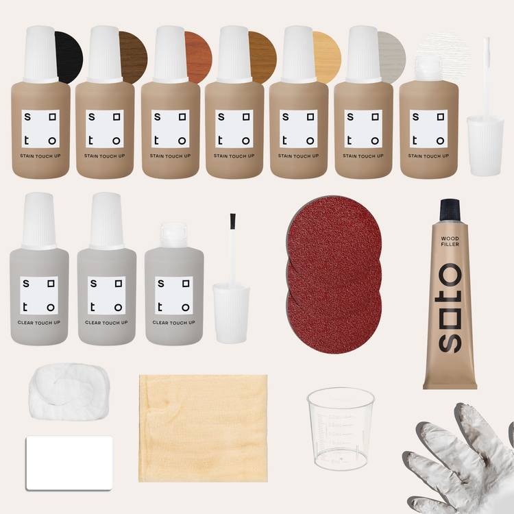 Includes everything you need for a beautiful repair: 7 different colors of high-quality wood stain and sealer in one, that offer the same beauty and durability of the original factory finish of your pieces; 3 bottles of Soto Clear Touch Ups in varying levels of gloss; Wood Filler + scraper for a smooth finish; a Mixing cup to create an even closer match, if needed; Tack Cloth for removing dust and particles; 3 sanding discs (80 grit, 120 grit, and 240 grit) to get your furniture prepped and smooth; as well as gloves and a Disposable Cotton Towel for easy clean-up.